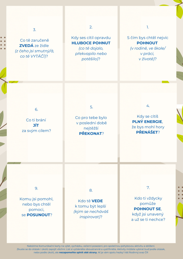 Všednodenní péče o vztahy jsou drobnosti, které vytvářejí stabilitu a bezpečí: zájem o druhé, otevřená komunikace, společné rituály, podporu, přijetí a laskavost. Takový vztahový „pohyb“ chrání děti i dospělé před stresem, osamělostí a psychickými obtížemi. Rodina, která spolu aktivně tráví čas, posiluje své zdraví ve dvou rovinách – fyzicky i vztahově. A potom se jí doslova lépe dýchá. Proto jsme letos připravili Komunikační karty, které vás inspirují k pohybu i povídání.
